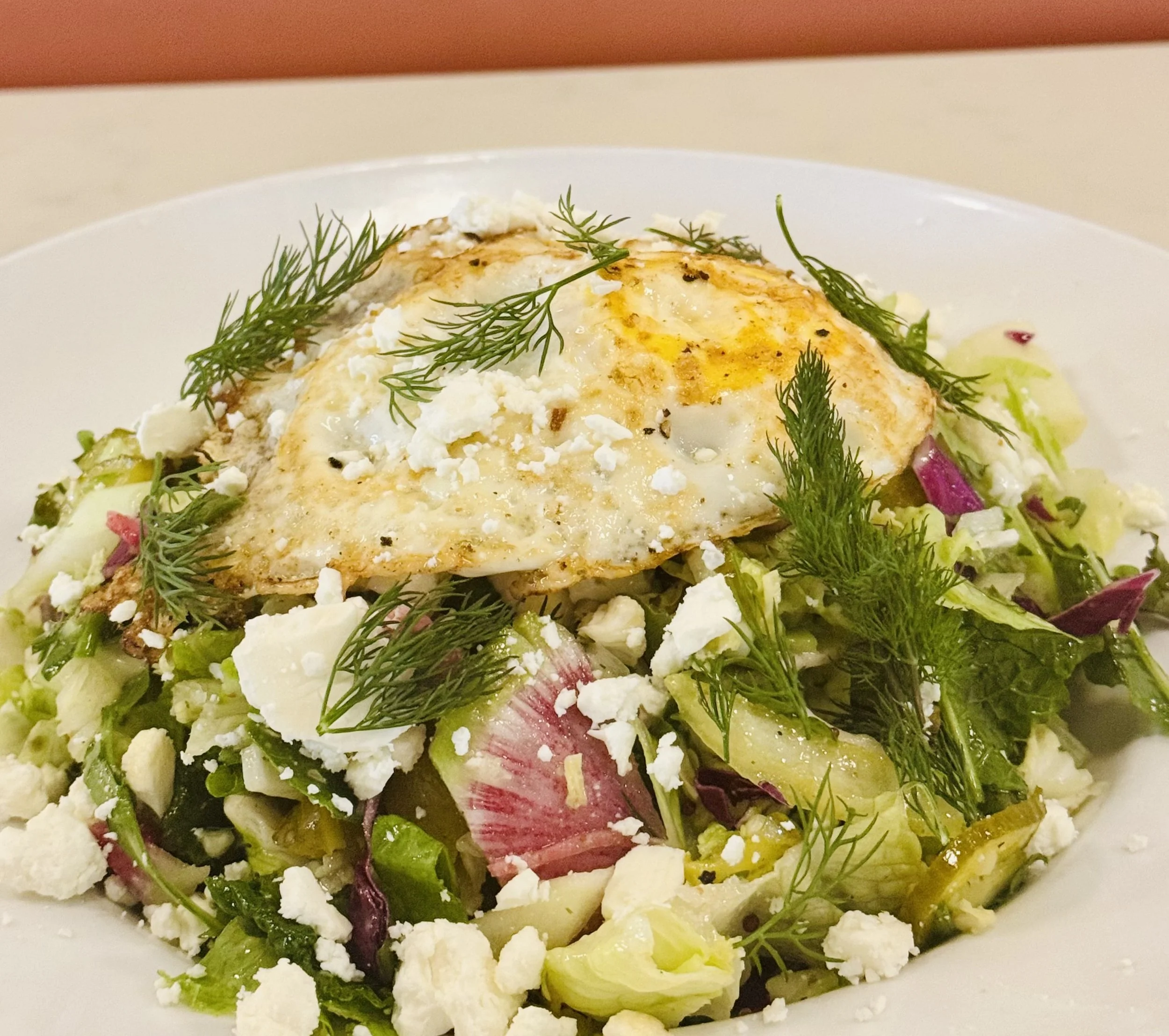 Chopped Kale and Romaine Lettuce, Red & Napa Cabbage, Dill Pickle, Cauliflower, Radish, Celery, tossed in Dill Pickle Vinaigrette and topped with Crumbled Feta Cheese, Scallion, a chilled, Hard-Fried Egg, a dash of Salt and Pepper and Fresh Dill
